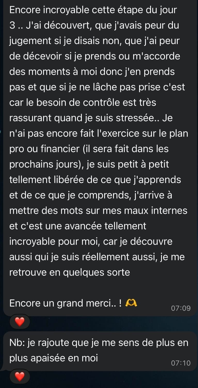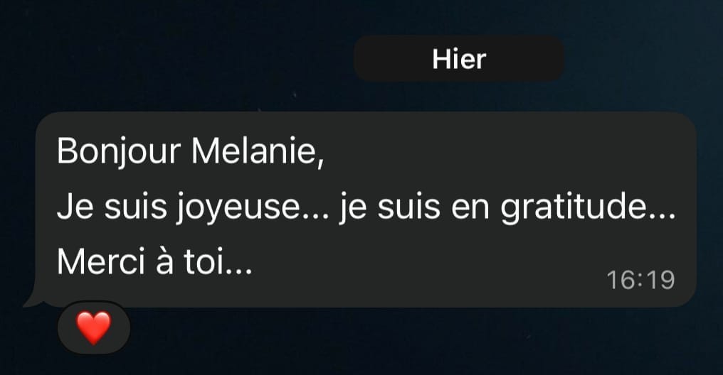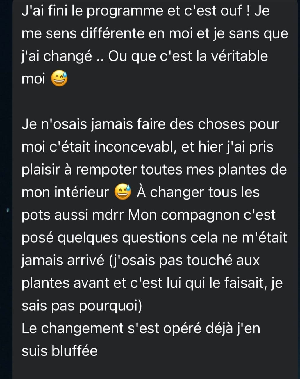 Les résultats ne sont pas instantanés ni magiques : ils sont le fruit d’un travail profond et d’une implication réelle. Si tu suis le programme, que tu fais les exercices et que tu es prêt(e) à libérer ce qui te bloque, alors les résultats seront là, comme pour 100% des personnes qui les ont suivies